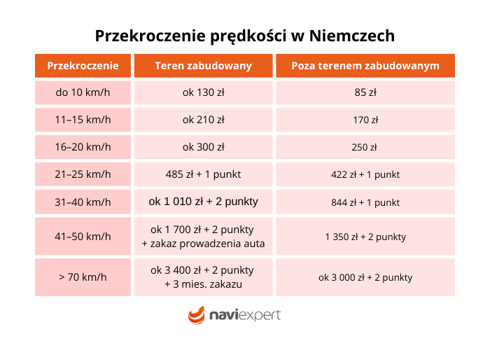 Mandat za przekroczenie prędkości w Niemczech zależy od tego, gdzie i o ile naruszysz limit. W terenie zabudowanym 21 km/h ponad dozwoloną prędkość to już 115* euro i 1 punkt karny. Przy 31–40 km/h w obszarem zabudowanym mówimy o 260 euro, 2 punktach i często zakazie prowadzenia pojazdów.