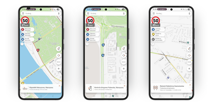 Od teraz, w głównym widoku nawigacji wyświetlą się trzy kluczowe zdarzenia z Twojego otoczenia. Zamiast przeklikiwać się przez mapę, masz pod ręką szybki przegląd tego, co może utrudnić Ci życie na drodze, w tym: