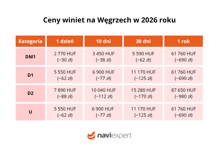 Oficjalny cennik winiet na 2026 rok (brutto, w forintach węgierskich – HUF) przedstawia się następująco. Dla ułatwienia podajemy także orientacyjne przeliczenie na złotówki (PLN):